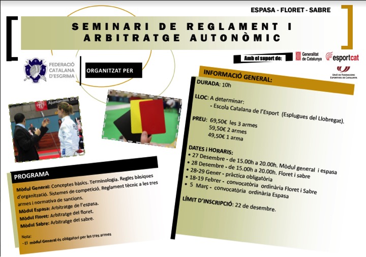 La Federació Catalana d’Esgrima convoca un seminari de reglament i arbitratge autonòmic en la modalitat d’espasa, floret i sabre que començarà el dia 27 de Decembre.